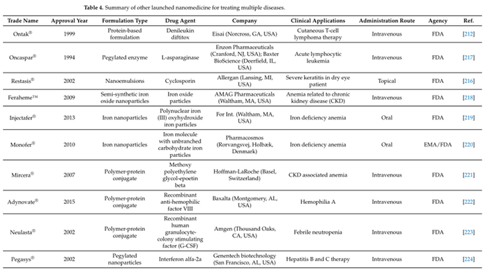 随着先进的合成或天然生物材料制备及NDDS的快速发展,各种新型纳米药物被开发成抗体-药物偶联物、细胞衍生载体、病毒载体、无机纳米颗粒、蛋白质纳米颗粒。这些纳米药物已被广泛应用于治疗或诊断各种疾病,包括肿瘤、传染病、炎症、血液疾病、免疫学疾病、心血管疾病、神经系统疾病、精神疾病、内分泌和代谢疾病等。如Ontak®是第一个通过基因构建的融合蛋白,被认为是一种结合靶向机制和细胞杀伤部分的重组分子。可用于如霍奇金病、类风湿性关节炎、银屑病、B细胞非霍奇金淋巴瘤、皮肤T细胞淋巴瘤(CTCL)和HIV感染。而Restasis®是一种环孢菌素纳米乳剂,用于干眼病的治疗。与此同时,许多用于不同适应症的新型纳米药物仍处于临床试验阶段。