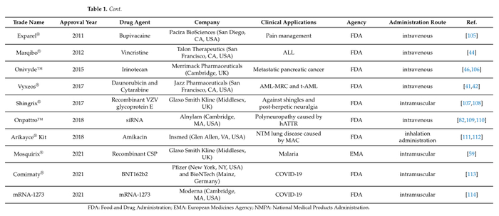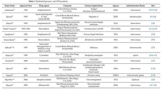 在过去的几年里,脂质体和LNPs从概念到脂载体在NDSS中的主流地位经历了一个漫长而曲折的道路。自1985年第一批脂质体进入临床试验以来,已有20多种脂质体和LNP获准上市,脂质体药物的成功进一步刺激了对脂质相关纳米粒的广泛临床研究。它们已被用于通过疫苗和基因药物输送进行疾病治疗的临床探索。