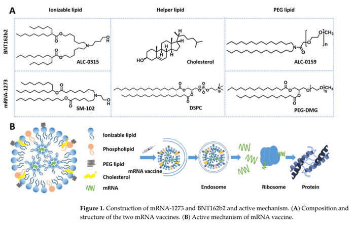 LNPs作为研究最多的纳米载体之一,经历了快速的技术发展并取得了重大进展。第一种siRNA药物Onpattro™ (一种新的小干扰核糖核酸(siRNA)LNP)于2018年推出,用于治疗hATTR多发性神经病,标志着LNP技术的里程碑式进步。LNPs作为信使RNA(mRNA)疫苗的重要组成成分,在保护和传递mRNA方面发挥着重要作用[87]。两种获批的信使核糖核酸疫苗mRNA-1273和BNT162b2以LNPs为载体,在预防感染方面显示出显著的效果。