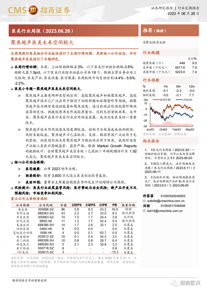 【招商医药&轻纺】医美行业周报(2023.6.26)——聚焦超声医美未来空间较大