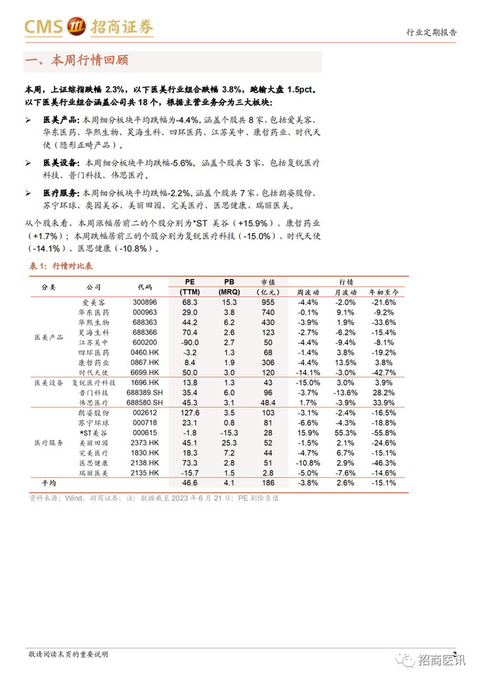 • 本周行情回顾:本周,上证综指跌幅-2.3%,以下医美行业组合跌幅-3.8%,跑输大盘1.5pct。以下医美行业组合涵盖公司共18个,根据主营业务分为三大板块:医美产品、医美设备、医疗服务,本周板块平均变动分别-4.4%-5.6%-2.2%