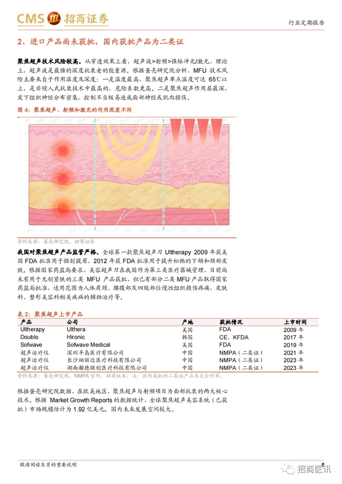 • 聚焦超声技术作用温度及深度都较高,控制不当极易造成面部损伤,风险系数较高。聚焦超声刀已在欧洲、美国、韩国等国广泛运用于无创紧肤,但在国内尚未有聚焦超声刀被批准应用于临床。我国对该类产品按三类医疗器械监管,监管严格。根据 Market Growth Reports的数据统计,全球聚焦超声美容系统(已获批)市场规模估计为1.92亿美元,聚焦超声医美未来空间较大