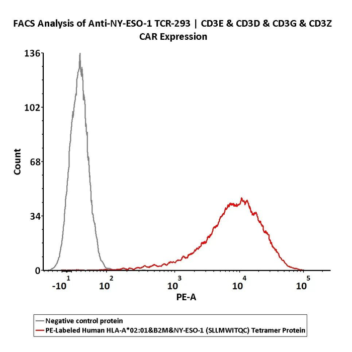 5e5 of NY-ESO-1 specific TCR-HEK293 cell line were stained with 100 μL of 1:25 dilution (4 μL stock solution in 100 μL FACS buffer) of PE-Labeled Human HLA-A*02:01&B2M&NY-ESO-1 (SLLMWITQC) Tetramer Protein and negative control protein respectively. PE signal was used to evaluate the binding activity.