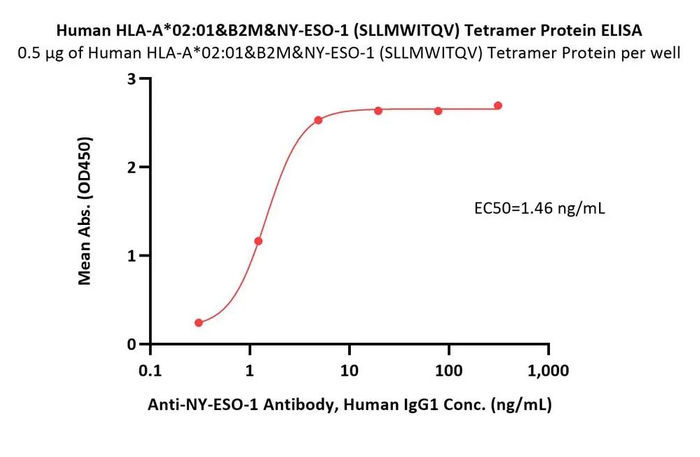 Immobilized Human HLA-A*02:01&B2M&NY-ESO-1 (SLLMWITQV) Tetramer Protein at 5 μg/mL (100 μL/well) can bind Anti-NY-ESO-1 Antibody, Human IgG1 with a linear range of 0.3-5 ng/mL.