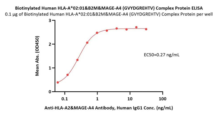 Immobilized Biotinylated Human HLA-A*02:01&B2M&MAGE-A4 (GVYDGREHTV) Complex Protein at 1 μg/mL (100 μL/well) on streptavidin (Cat. No. STN-N5116) precoated (0.5 μg/well) plate can bind Anti-HLA-A2&MAGE-A4 Antibody, Human IgG1 with a linear range of 0.1-1 ng/mL.