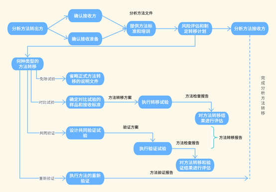 对于分析方法的转移,2020版《中国药典四部》和2019年版《中国药品检验标准操作规范》中都有介绍。分析方法的转移分为:分析方法转移类型、分析方法转移要素、分析方法转移方案、分析方法转移方法、分析方法转移报告五个部分。流程图如下: