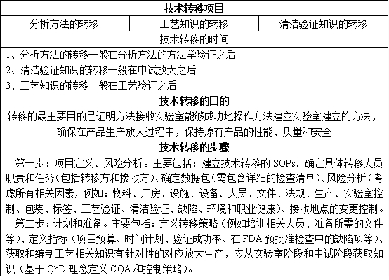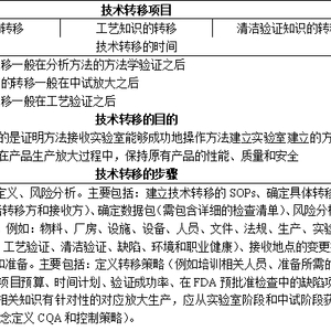 对于技术转移,分析界的筒子们应该并不陌生,提到技术转移,我们首先想到的是“技术转移都需要转移什么?什么时间进行转移?转移的目的是什么?如何进行转移?”等问题。对于这些问题,下面的表格进行了简单的介绍。今天,我们着重分享的是分析方法的转移。