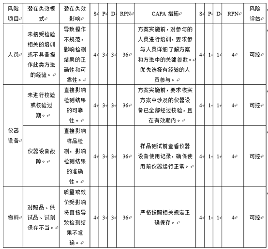比对试验是分析方法转移时最常用的方法,需要接收方和转移方共同对预先确定数量的同一批次或多批次样品进行对比检验,然后对比检验结果。对比试验中需要考虑的因素主要包括:被测样品的数量、批次(2~5批);被测样品的浓度级别(1~3个浓度);重复测定的次数(4~6次);被分析物个数(1~2个);分析时间(2~5天);来自一个或多个实验室的分析仪器(两个实验室使用相同的仪器)等。以上参数均可根据风险评估的结果(如下图)进行适当的调整。