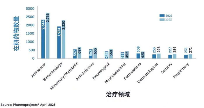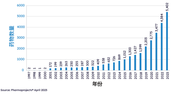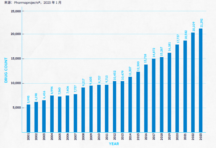 过去三年,新冠疫情影响下制药行业的动荡逐步平息,全球研发开始步入稳定增长的阶段。据Pharmaprojects® 2023年1月数据显示,2023年全球管线总规模再创新高,全球药品及疫苗数量共计21292个,较去年上涨5.9%。