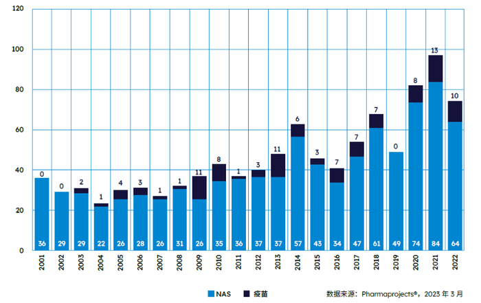 在《2023年医药研发年度回顾》的基础上推出的补充报告《2022年上市的新活性物质》, 就全球研发成果上市情况进行深入解读。纵览过往五年,全球推出的NAS(新活性物质,New Active Substance)数量一路上扬,彰显了全球医药创新的蓬勃生机。报告指出,2022 年全球共推出 73 款新药,其中包含 74 种新活性物质,是全球制药史上排名前三的年份。