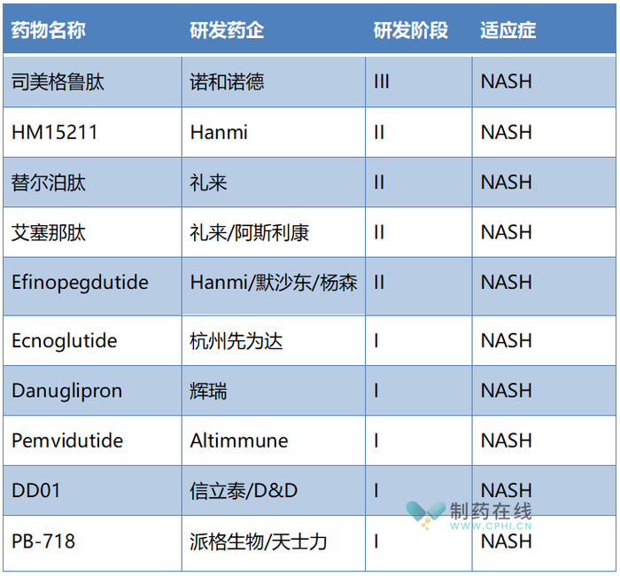 NASH治疗领域在研GLP-1类药物(公开资料)