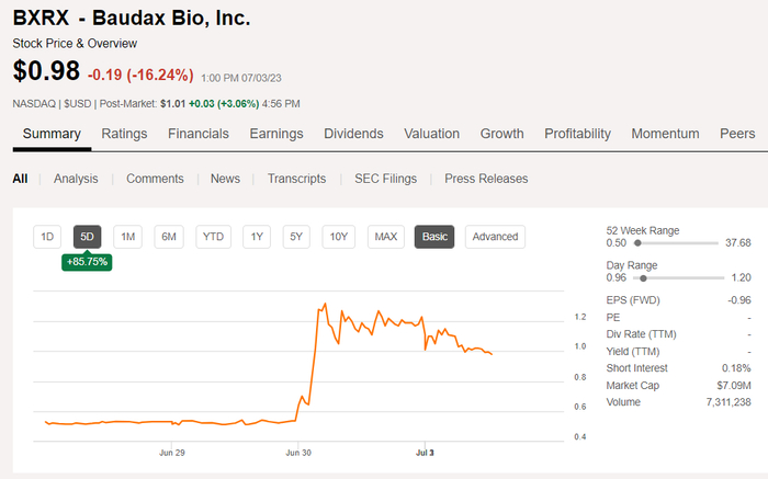 昨日发布,Baudax Bio(纳斯达克股票代码:BXRX)宣布收购了 Teralmmune。Teralmmune是一家私营生物技术公司,专注于研发治疗自身免疫性疾病新型Treg细胞疗法。消息传出后,Baudax Bio 股价于 6 月30 日飙升近 125%,目前市值为709万美元。
