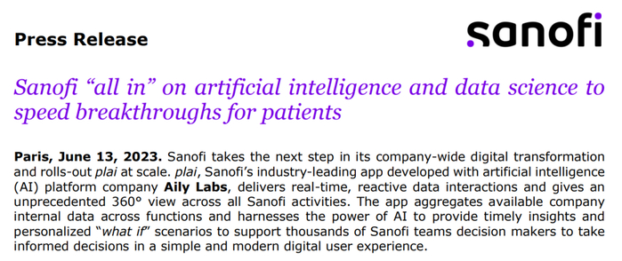值得一提的是,2023年6月13日,赛诺菲宣布“All In”人工智能和数据科学,为病人带来加速突破。