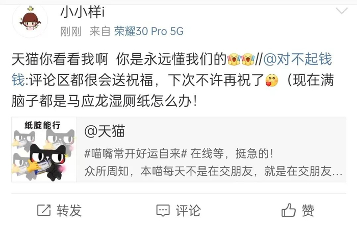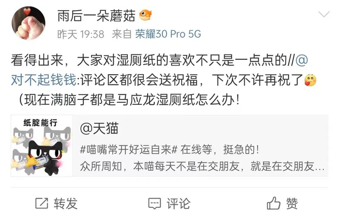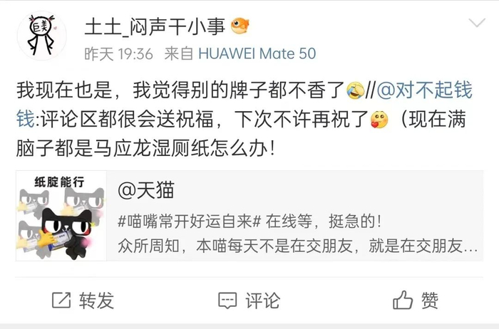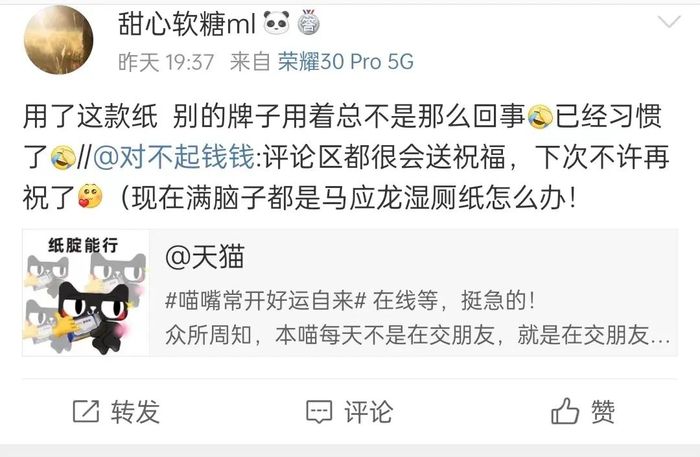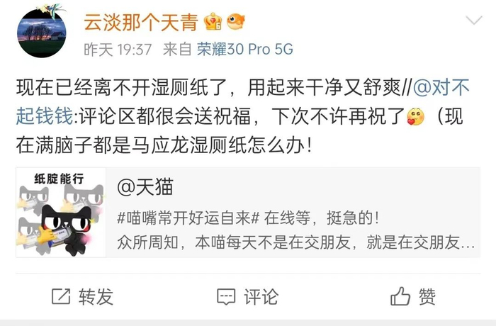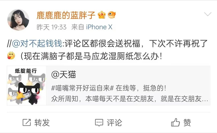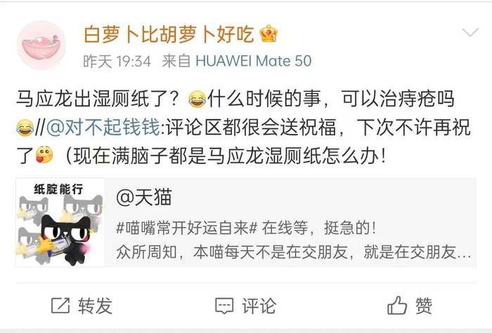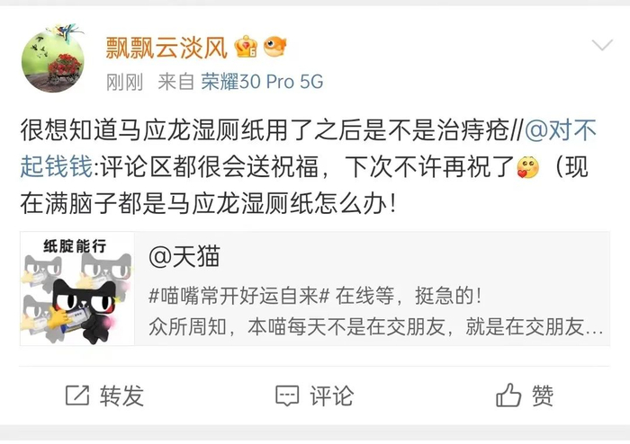 “评论区都很会送祝福,下次不许再送了,现在满脑子都是马应龙湿厕纸怎么办”