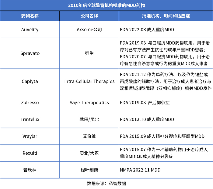 随着对MDD研究的深入,以及医药技术的发展,2010年以来全球监管机构批准了多款MDD新药,详见下表。
