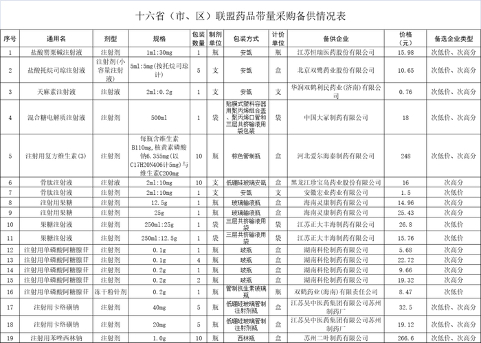十九省(区、兵团)药品联盟采购由河南、山西、内蒙古、辽宁、吉林、黑龙江、安徽、江西、湖南、广西、海南、贵州、云南、西藏、陕西、青海、宁夏、新疆、新疆生产建设兵团等组成省际联盟,对包括肌苷注射剂、环磷腺苷注射剂、苯唑西林注射剂、多种维生素(12)注射剂等24个药品开展带量采购。
