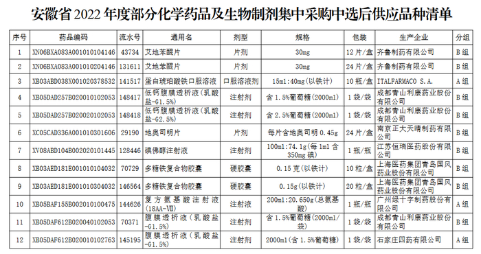附件4:安徽省 2022 年度部分化学药品及生物制剂集中采购中选后供应品种清单