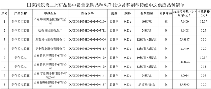 附件6:国家组织第二批药品集中带量采购品种头孢拉定常释剂型接续中选供应品种清单