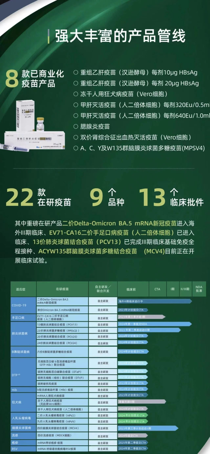 其中主打产品为重组乙型肝炎疫苗(汉逊酵母)。该疫苗采用国内首创、国际先进的重组汉逊酵母表达技术平台以及专利的原位吸附工艺,确保了更高的稳定性和良好的免疫原性。