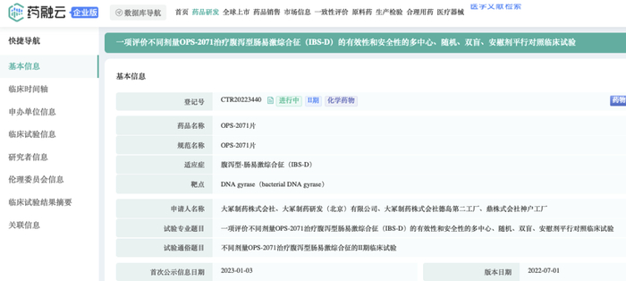 研发代码为OPS-2071,在日本、美国都进入了临床2期阶段;药融圈旗下,药融云数据www.pharnexcloud.com显示:本品已经启动在中国的2期临床试验,用于治疗腹泻型-肠易激综合征(IBS-D)。据悉,本品为大冢上海开发的小分子新药。