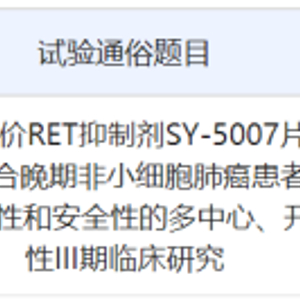 根据中国药物临床试验登记与信息公示平台信息,首药控股启动了一项3期临床研究,以评价RET抑制剂SY-5007片在RET融合晚期非小细胞肺癌(NSCLC)患者中的有效性和安全性。该试验主要研究者为上海市肺科医院主任医师周彩存教授。公开资料显示,SY-5007是由首药控股研发的一款高活性小分子RET酪氨酸激酶抑制剂,拟用于治疗RET阳性非小细胞肺癌及甲状腺癌。