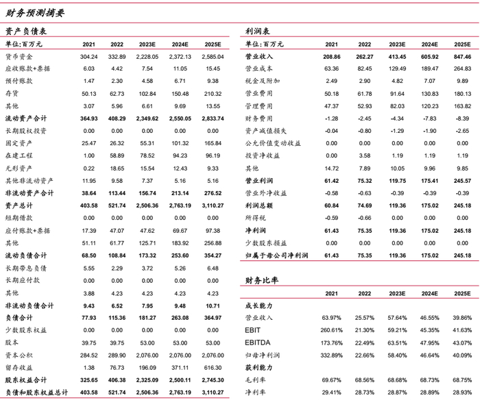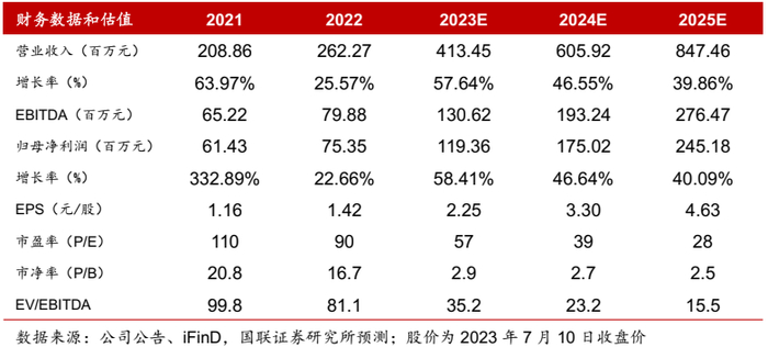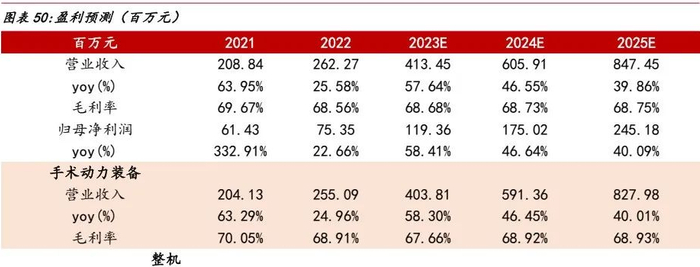 我们预计公司2023-2025年收入分别为4.13/6.06/8.47亿元,增速分别为57.64%/46.55%/39.86%,毛利率分别为68.68%/68.73%/68.75%。择期手术的逐步恢复,以及手术微创化趋势,有望带动公司核心手术动力装置系统营收的稳步增长。;随着公司耗材类产品销售增加,高毛利产品带动整体毛利率提升,另外规模优势对费用率进一步优化,预计公司2023-2025年归母净利润分别为1.19/1.75/2.45亿元,增速分别为58.41%/46.64%/40.09%。