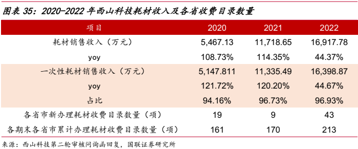 2020-2022年,国内各省市累计办理耗材收费目录数量从161项,增加至213项,公司通过市场推广及学术支持、平台挂网、入院使用等方式提升自身影响力,积极参与国内各地医疗收费目录工作,一次性耗材收入稳步增长,自2020年5.15千万元,提升至2022年1.64亿元,复合增长率为78.48%,同时占耗材收入比例持续提升。