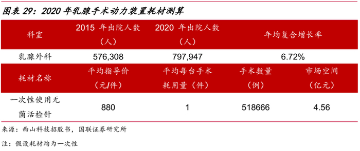 以《2021中国卫生健康统计年鉴》中披露的2020年乳腺外科出院人数为基础,假设65%的患者需要进行乳腺活检或良性组织切除,预计2020年全国乳腺外科旋切手术数量约51.87万例,结合公司招股书披露一次性使用无菌活检针平均指导价,对应市场空间约为4.56亿元。