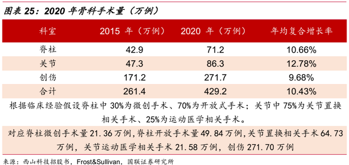 据Frost&Sullivan统计,骨科手术量从2015年为261.4万例,2020年增至429.2万例,其中创伤类手术占比达到2020年骨科手术量63.3%,但复合增长率低于脊柱和关节。脊柱和关节手术中,按手术方式和临床方向,分成微创、开放、置换等。