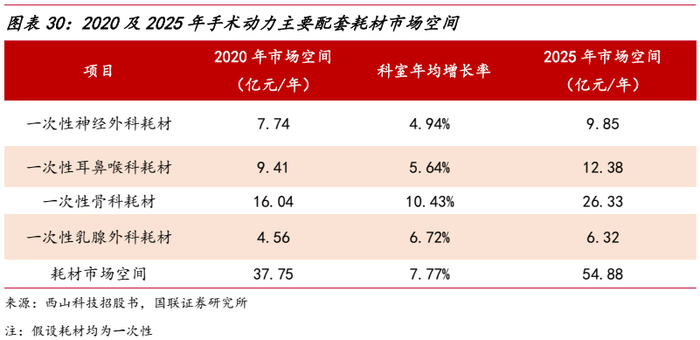 手术耗材主要与住院手术人数相关,综合以上测算结果及各科室出院人数增速,2020年,一次性骨科手术动力装置耗材的市场空间约16.04亿元;一次性耳鼻喉科手术动力装置耗材的市场空间约9.41亿元;一次性神经外科手术动力装置耗材的市场空间约7.74亿元,合计2020年手术动力主要配套耗材市场空间约为37.75亿元左右。根据公司招股书及卫生健康统计年鉴披露科室就诊人数增速,推算得到2025年对应耗材市场空间约为54.88亿元。