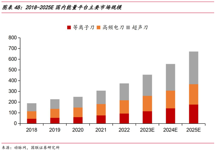 基于动脉网披露2021年数据,超声刀市场空间为125亿元,相较等离子刀和高频电刀更大,同时2021-2025年复合增长率为24.88%,增速最快;同期等离子刀和高频电刀市场分别为76.5和70.5亿元,预计2025年三大细分能量手术器械市场规模总和有望达到672.2亿元,2021-2025年复合增长率为21.64%。