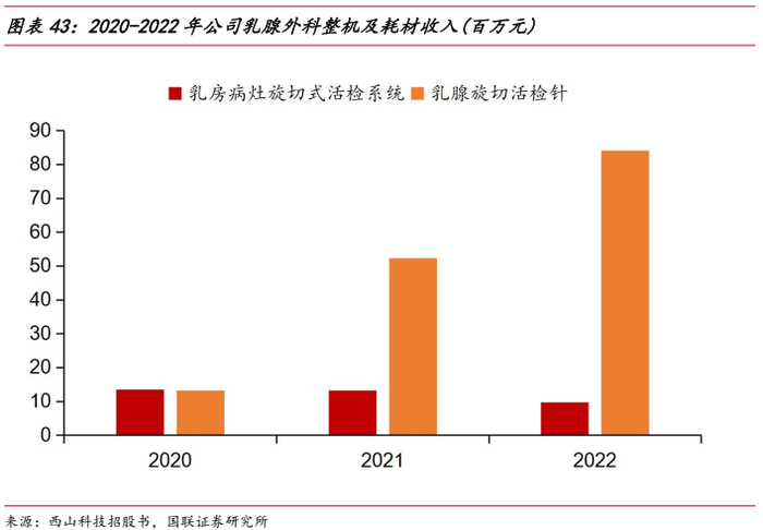 2020年下半年,公司推出乳房病灶旋切式活检系统,推出后迅速获得市场认可,2021年乳房病灶旋切式活检系统中标情况位居国内第三,国产首位,随着乳腺外科整机持续销售,耗材收入快速增长,2022年收入达到8408.60万元,2020-2022年复合增长率达到151.64%。公司新建乳腺外科产品车间,为订单的及时供应提供保障。
