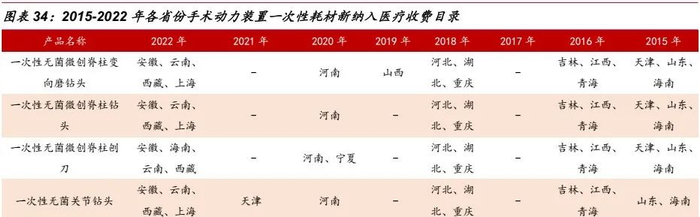 自2015年以来,多地医保局及卫健委已逐步将各类手术动力装置的一次性刀具纳入到医疗服务价格项目中,流程由医院发起,经各省医保局及卫健委审核,一般发布申报通知1-1.5年后进行公示,公示2-3个月后开始实施。一次性耗材纳入医保收费目录有望推动耗材一次性化的进程,带动相关耗材的使用量,提高诊疗综合效果。