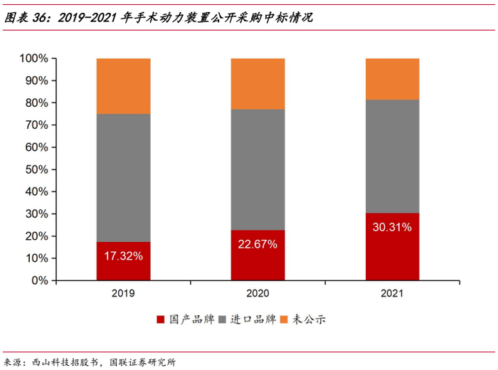 耗材销售的稳步增长,带动配套手术动力装置的推广,随着国产设备质量的不断提升,国产手术动力装置在医疗机构的使用也逐步增加,根据2019-2021年公开采购中标信息,国产品牌中标数量从17.32%增长至30.31%。