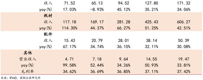 手术动力装备仍是公司占比最大的业务,预计2023-2025年收入分别为4.04/5.91/8.28亿元,占整体收入比例分别为97.82%/97.52%/97.76%,增速分别为58.30%/46.45%/40.01%,国内多个省份持续增加一次性耗材医保收费目录,有望带动耗材增长,对配套闭环整体设备的推广具有协同作用,随着耗材的占比持续提高,预计产线整体毛利率将稳步提升,毛利率分别为67.66%/68.92%/68.93%。