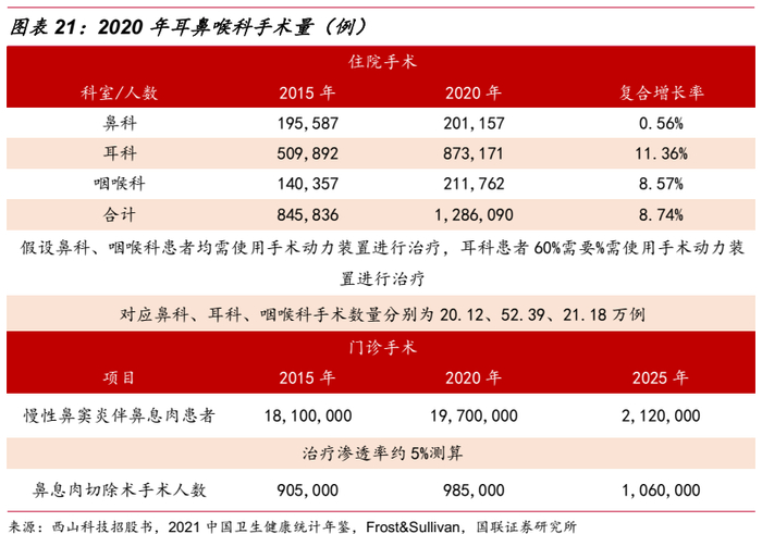 耳鼻喉科手术分为门诊和住院类,其中前者以慢性鼻窦炎伴鼻息肉切除手术为主。住院类患者人数以《2021中国卫生健康统计年鉴》中披露的2020年鼻科、儿科、咽喉科出院人数为基础,门诊类参考Frost&Sullivan统计的慢性鼻窦炎伴鼻息肉患者人数,测算如下:
