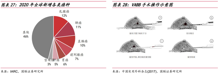 乳腺组织活检是乳腺癌诊断的金标准,活检方式包括开放式手术活检、细针吸取活检、空芯针穿刺活检、真空辅助活检(VAB)等技术手段。真空辅助活检技术诞生于1995年,由麦默通公司基于空芯针活检技术发明,主要由旋切刀和真空抽吸泵两大装置组成,在影像引导下对乳腺可疑病灶进行重复切割,以获取组织学标本用于乳腺疾病的活检。