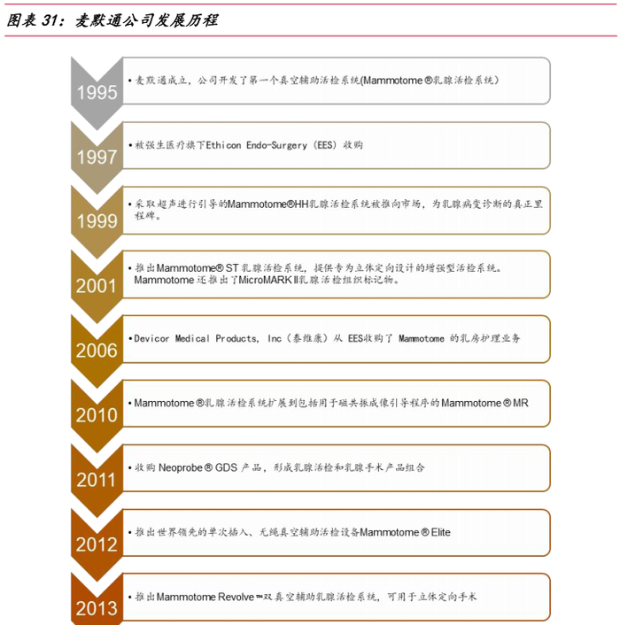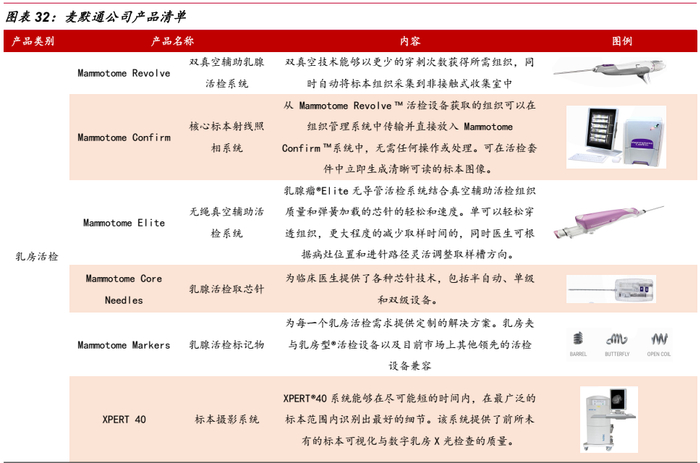 麦默通(Mamotome)是全球乳腺外科医疗器械领先者,公司成立于1995年,同年开发首个真空辅助活检系统(VAB),并持续围绕乳腺活检深度布局,与超声、核磁等产品联合使用,形成乳房活检、乳房手术解决方案。