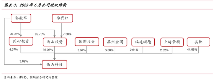 西山科技股权较为集中,董事长郭毅军直接持股3.09%;郭毅军、李代红夫妇持有西山投资全部股权,西山投资持股西山科技比例为36.06%,为公司实控人。截至2023年6月21日,公司股权结构如下: