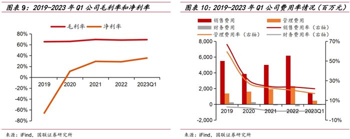 盈利能力逐步提升。毛利率稳步有升,净利率大幅提升。得益于公司营收规模效应逐步显现,三费比率稳步下降,其中销售费用率从2020年的30.30%下降至2023Q1的21.82%,管理费用率从2020年的27.37%下降至2023Q1的16.91%,使得公司盈利能力逐步提升,净利率在2020年转正达到11.1%,并在2023Q1进一步扩大到35.5%。