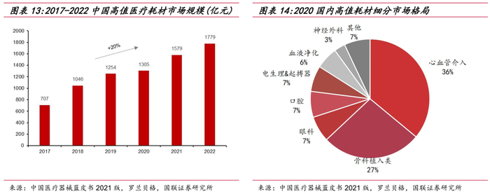 2022年国内高值医疗耗材市场规模为1,779亿元,2017-2022年复合增长率为20%,其中心血管介入类和骨科植入类耗材合计份额超过63%,电生理、血液净化等细分产品占比靠前。