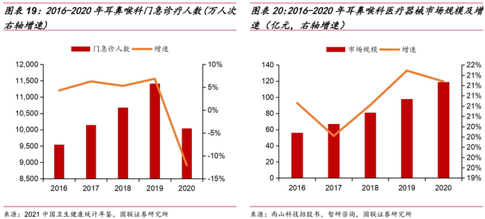 耳鼻喉疾病主要包括鼻咽恶性肿瘤、慢性扁桃体和腺样体疾病、耳和乳突疾病、慢性鼻窦炎四大类,2016-2019年,国内耳鼻喉科门急诊人次自9545万上升至11417万,2020年受宏观环境影响,有所下滑。2016-2020年,国内耳鼻喉科医疗器械市场规模由56亿元增长至119亿元,复合增长率为20.7%。公司在耳鼻喉科除专用手术动力装置外,耗材端布局包括鼻刨刀、鼻钻头、咽刨刀、喉刨刀等,可应用于慢性鼻窦炎、慢性扁桃体腺样体疾病、耳和乳突疾病等手术中。