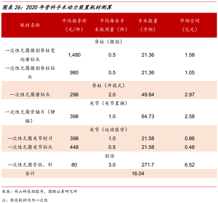 根据平均每台手术耗用量及公司产品售价推算,2020年一次性骨科手术动力装置耗材的市场空间约16.04亿元。