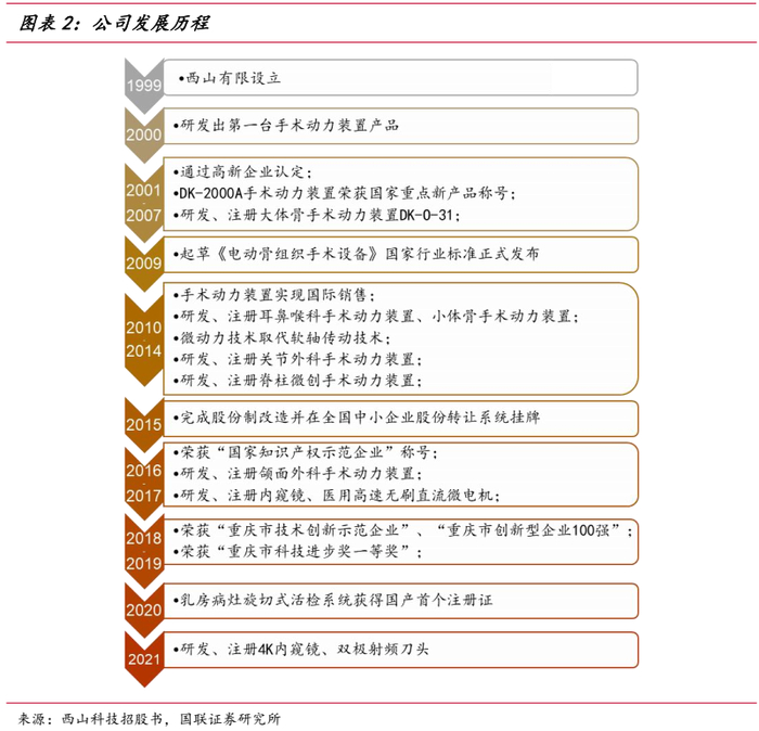公司成立于1999年,次年便推出第一台手术动力装置产品。经过10年以上的研发沉淀,2010-2014年间,公司迎来新品突破期,相继推出耳鼻喉科、小体骨、关节外科等手术动力装置,实现从单一设备到医院多科室解决方案的业务布局。2015年公司完成股份制改造,并在股转系统挂牌。2016-2017年间,公司成功研发内窥镜、医用高速无刷直流微电机等产品,未来公司将利用积累的行业经验,为临床提供更加丰富的产品组合。