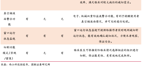 公司乳房病灶旋切式活检系统参数媲美全球龙头麦默通和安珂同类产品,针对临床操作痛点,设计刀具自动识别功能,不同刀具接入后能自动调整工作参数,减少设置时间,优化手术步骤。取样窗口调节上,开窗大小从5-30mm连续可调,小窗口可满足微小病灶切除,大窗口能在单词旋切获取更大样本量。