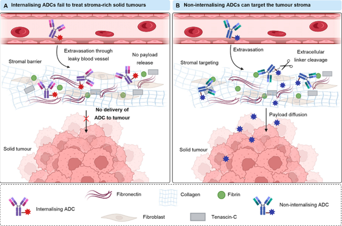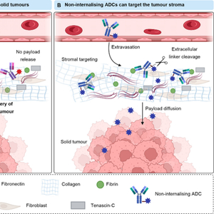 许多实体瘤中致密的细胞间基质阻碍大分子物质渗透到肿瘤深处,限制ADC成功治疗实体瘤。非内化ADC在基质中积累可以使胞外载药在肿瘤微环境中释放,然后载药可以扩散到附近的肿瘤细胞,发挥强旁观者效应,改善活性药物对实体瘤的渗透性。改良后的肿瘤细胞外基质包括胶原蛋白、纤维蛋白、纤连蛋白、Tenascin-C,鉴于其足量、稳定性和选择性出现在肿瘤基质或血管中,它们成为非内化ADC的潜力靶点。