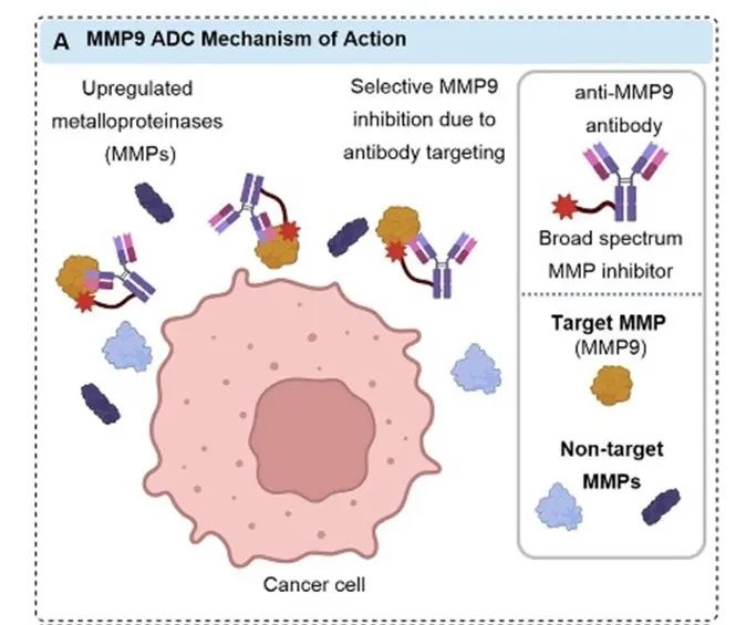基质金属蛋白酶(MMPs)在癌症进展中起着多种作用。Merritt等人开发了一种胞外ADC,通过将泛MMP抑制剂与高度特异的MMP9靶向抗体偶联,使抑制剂与MMP9密切接触,从而有选择地抑制该金属蛋白酶。尽管没有评估其体内外的抗癌活性,但证明了ADC可以有效地靶向胞外蛋白。这种方法可能有助于改进小分子MMP抑制剂的选择性和有效性。