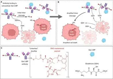 半乳糖凝集素-3-结合蛋白(Gal-3-BP)是大多数癌症中大量持续分泌的,这使其成为靶向癌症微环境的ADC的一个有吸引力的靶点。研究者开发了一种对Gal-3-BP的凝集素结合域具有特异性的人源化抗体,通过直接与C端半胱氨酸和含硫醇的DM1、DM3或DM4形成二硫键,以“无接头”方式实现药物的偶联。