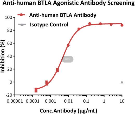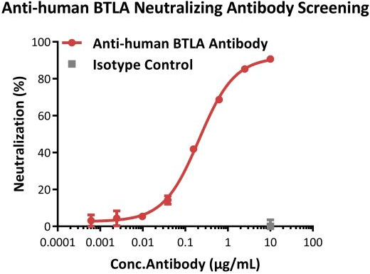 Inhibition of human BTLA overexpressing on CHO cells induced reporter activity by anti-human BTLA antibody. Human HVEM (Luc) HEK293 Reporter Cell was incubated with serial dilutions of antibodies in the presence of CHO/Human BTLA Stable Cell Line. The EC50 of anti-human BTLA neutralizing antibody is approximately 0.212 μg/mL.
