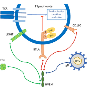 HVEM和BTLA之间相互作用是最早被发现的Ig结构与TNFR家族之间的连接。HVEM除BTLA之外还有其他配体(图1),如CD160、LIGHT、淋巴毒素-α (LTα) 和单纯疱疹病毒糖蛋白D 。HVEM在调节T细胞中起到双重作用,HVEM与BTLA、CD160结合时触发共抑制信号,而HVEM与LIGHT、LTα结合则传递共刺激信号。因此,HVEM通常被描述为取决于所接合配体的分子开关[1]。